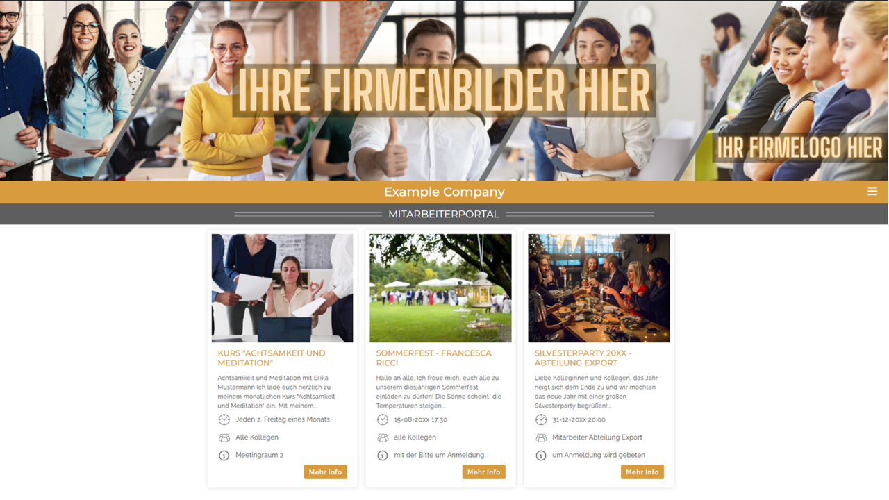 Bestücken Sie Ihr firmeneigenes Mitarbeiterportal mit attraktiven und spannenden Firmenevents sowie individuell konfigurierbaren Teambuilding- und Unterhaltungsprogrammen. So können z.B. Inhalte wie das Sommerfest oder die Weihnachtsfeier integriert werden, für Meetings und Seminare Rahmenprogramme eingestellt sowie Angebote für die Mitarbeitergesundheit gelistet werden. Sämtliche Kategorien sind inhaltlich frei konfigurierbar. Und das beste: Programme einzustellen ist kinderleicht und kann von jedem Mitarbeiter und jeder Mitarbeiterin vorgenommen werden. So bleibt Ihr Firmen Mitarbeiterportal aktuell, spannend und stets attraktiv.
